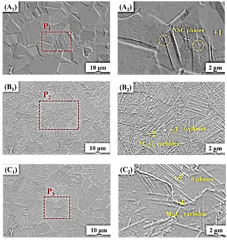 (A1)原样;(A2)图2 (A1) P1放大;(B1)时效样品;(B2)P2放大(B1);(C1)腐蚀试样;(C2) P3放大