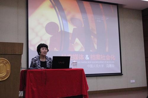10月18日下午3:30,在东区国商楼蔡冠深讲堂,中国人民大学常务副校长、博士生导师、国务院学位委员会学科评议组召集人、国家自然科学基金、国家社科基金评审专家、教育部社会科学委员会委员、教育部档案学专业教学指导委员会主任冯惠玲教授于百忙之中来到图书情报档案系,给全体师生带来一次精彩的学术讲座——《社交媒体&档案社会化》。出席此次讲座的有图情档系主任金波教授、副主任于英香教授、王向明副教授、连志英副教授、刘宇副教授等,图情档系全体研究生、本科生同学聆听了讲座。