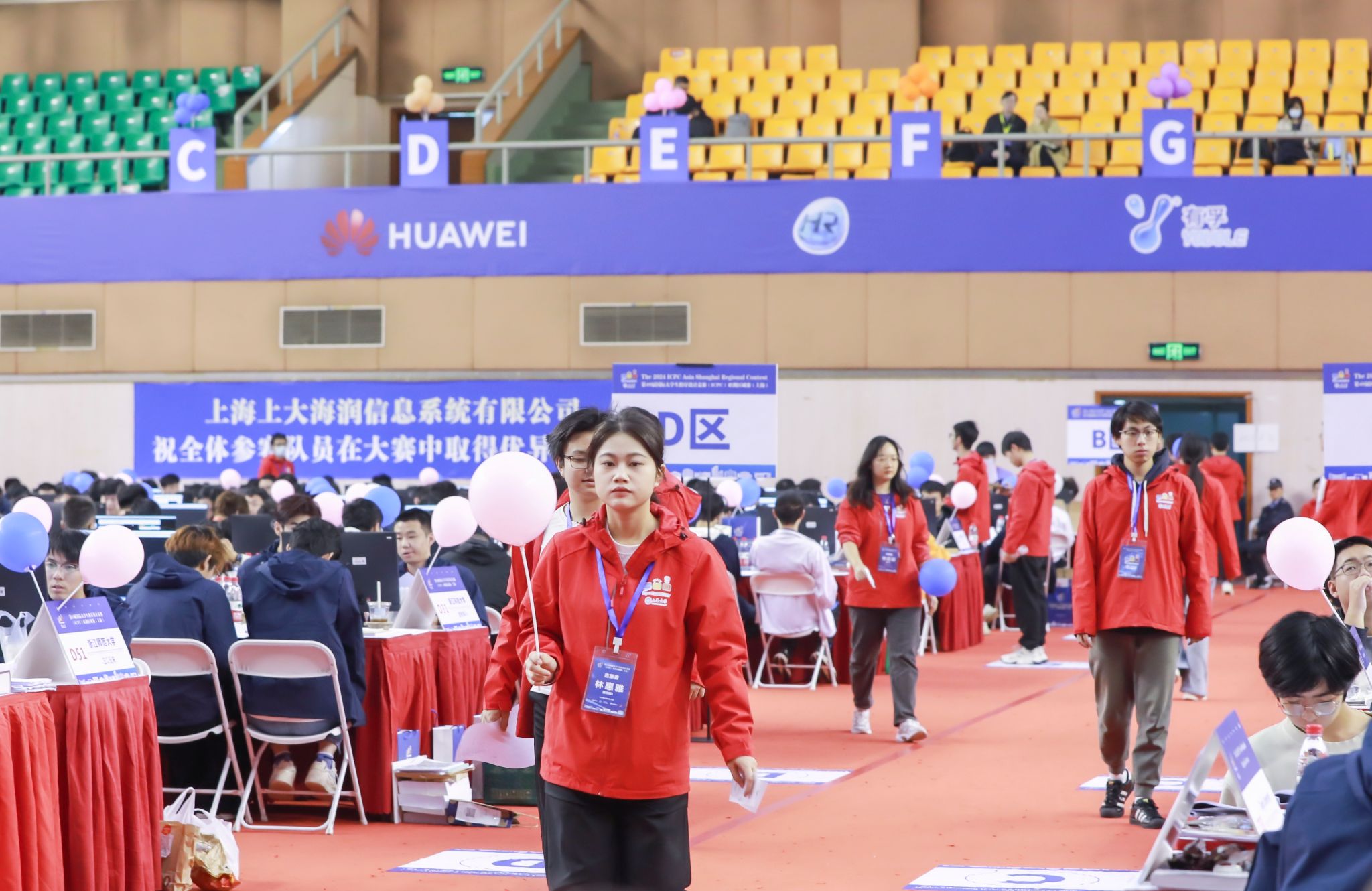 正式比赛于11月17日9:00准时开始,宽敞明亮的体育馆内,数百台电脑整齐排列,每位参赛选手都全神贯注,手指在键盘上跳跃飞舞,将脑海中的算法思路迅速转化为一行行代码,争分夺秒地解决着一个个复杂的问题。比赛开始6分11秒后,来自洛谷科技的参赛队率先解出I题,收获了一支“First Problem Solved”气球。