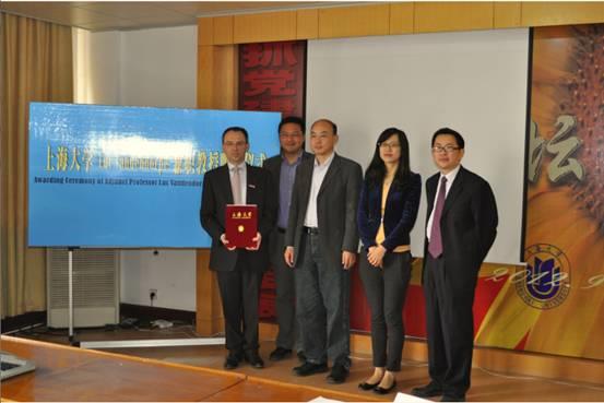 |         2013年4月10日上午,比利时鲁汶大学Luc Vandendorpe教授在通信学院方勇副院长的邀请下访问我院。Luc Vandendorpe教授首先访问了智能与集成技术实验室,就无线体域网中的高能效数据传输技术研究进行了深入交流,并就此领域的国际合作研究达成一致意向。随后,Luc Vandendorpe教授在方勇副院长、王涛教授的带领下,参观了我院的特种光纤与光接入网重点实验室。最后,在王廷云执行院长的主持下,举行了Luc Vandendorpe教授受聘我院兼职教授的受聘仪式,并就进一步加深通信学院与鲁汶大学的深入研究交流达成共识。随后,Luc Vandendorpe教授为师生进行了讲座。         Luc Vandendorpe教授为IEEE Fellow,任鲁汶大学通信技术与电子应用及数学学院院长,担任国际著名期刊主编。在无线传感器网络及无线通信系统领域发表IEEE期刊论文近100篇,被引用4000余次。目前正在主持欧盟FP7资助的NEWCOM项目、SCOOP项目及BESTCOM项目。 |